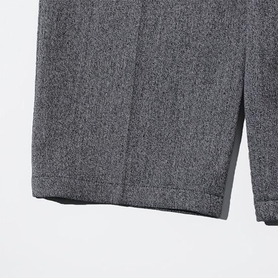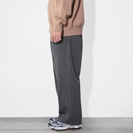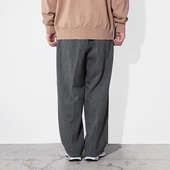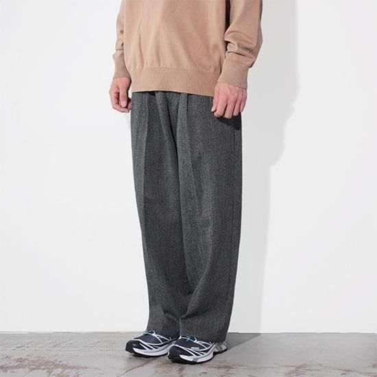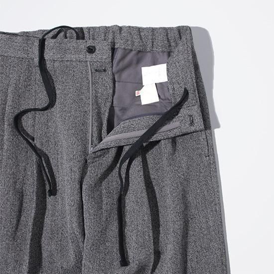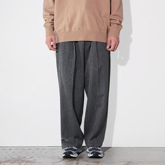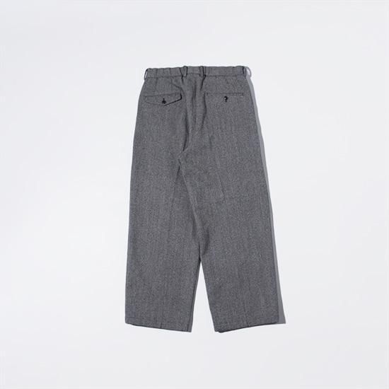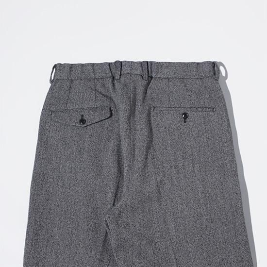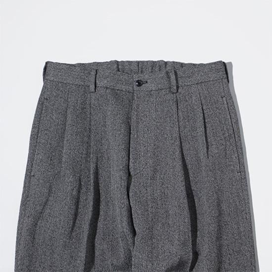クラシックなドレストラウザーをベースに作られたフロントが2タック、後身頃がウエストゴム仕様のワイドトラウザー。