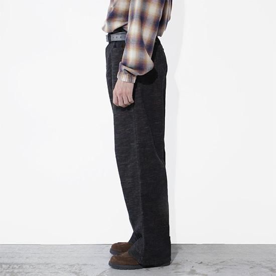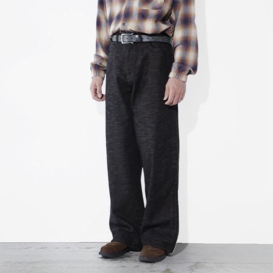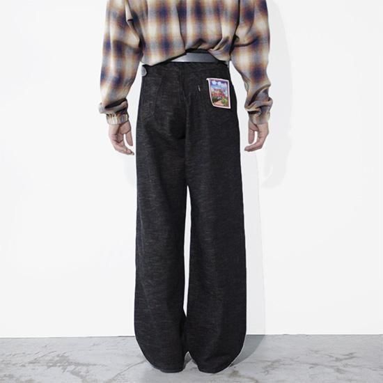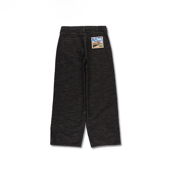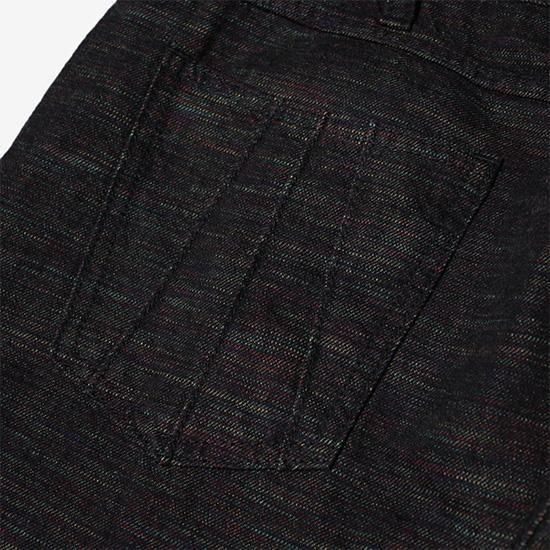 生地の製作から縫製まで全行程をデニムの産地岡山にて製造。縦糸にインディゴ、横糸にカスリ糸を使用しており、履き込むごとに色落ち、ムラ感がコントラストとして現れる一本。