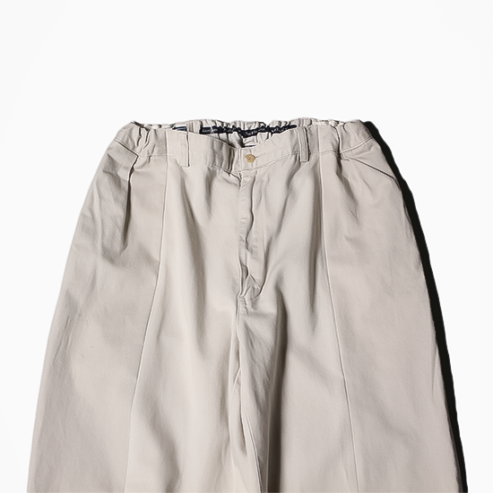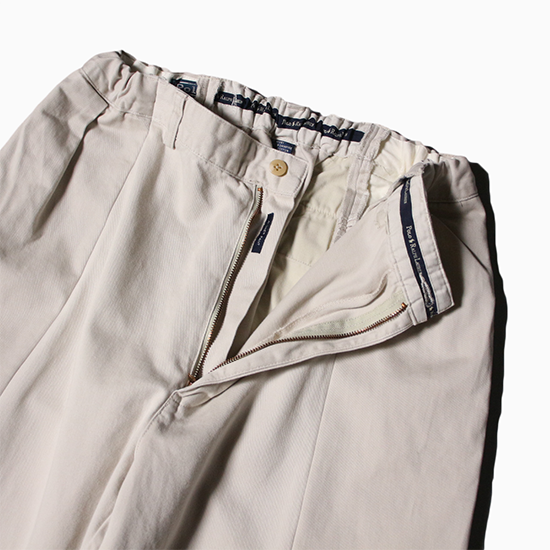 ドッキングイージーパンツは、USEDのRLチノパンツ2本を、縦方向に裁断した後に縫い合わせて作られている。