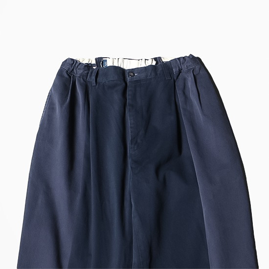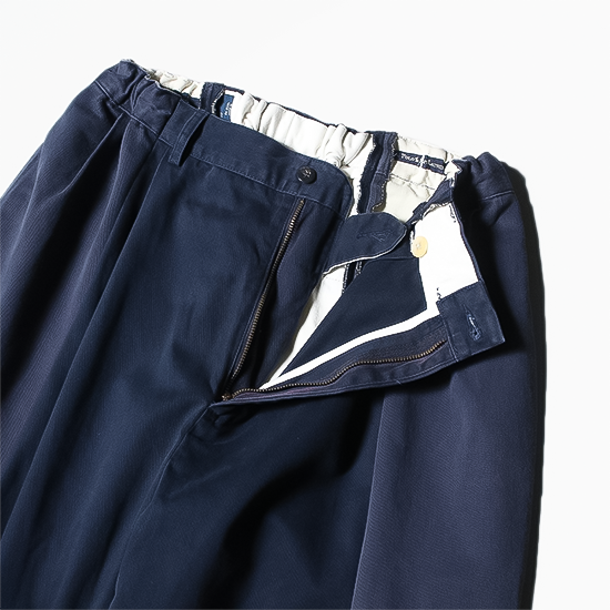 ドッキングイージーパンツは、USEDのRLチノパンツ2本を、縦方向に裁断した後に縫い合わせて作られている。