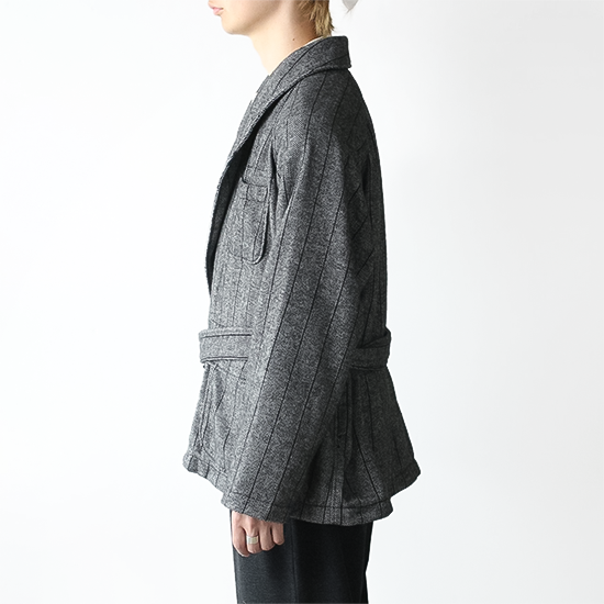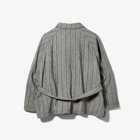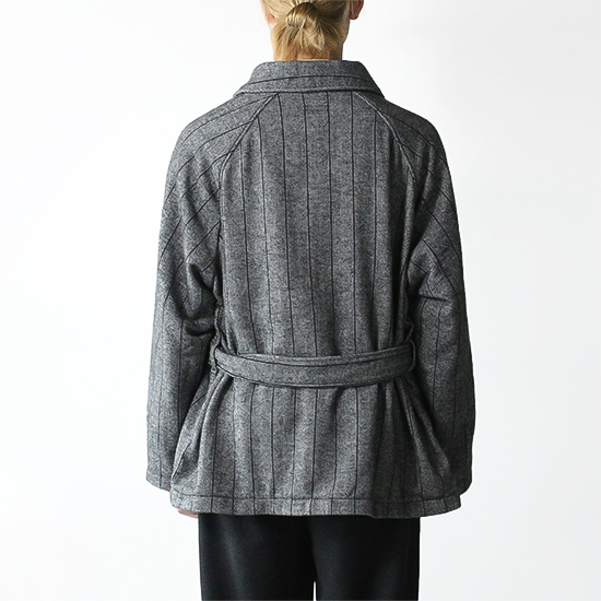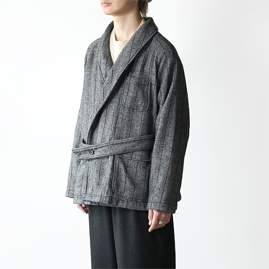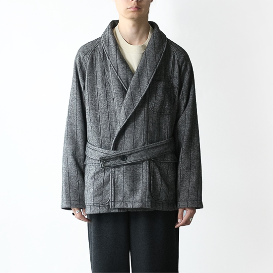 ショールカラーや腰のベルトがガウンを連想させるリラックスしたムード。