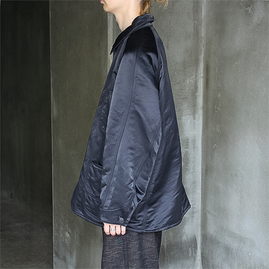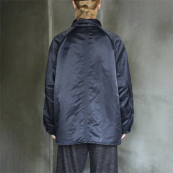 カバーオールらしいトリプルステッチやラグランスリーブ、やや中央に傾けて配置された左右非対称な胸ポケットに蝶の刻印のメタルボタンなど、特徴的なディテールが詰まったデザイン。