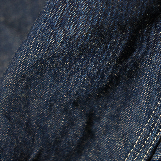 経糸はワーク系デニムにありがちな長いムラ糸ではなく、時折欠点のように点在する短いムラ感を再現した糸を使用。