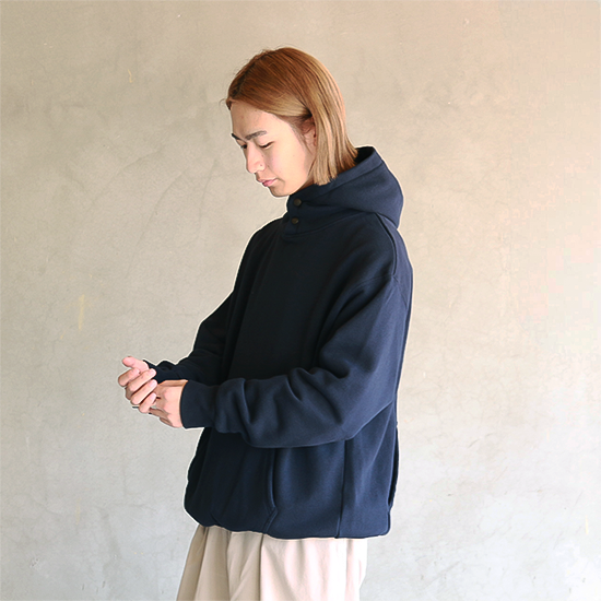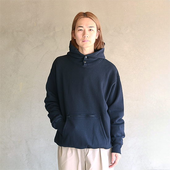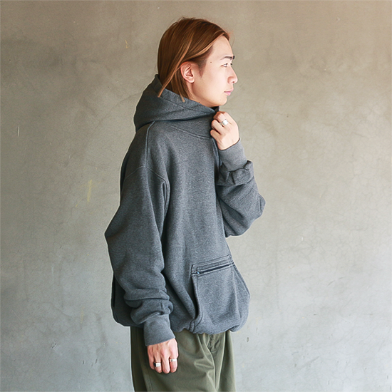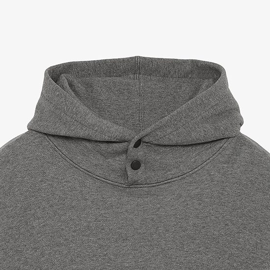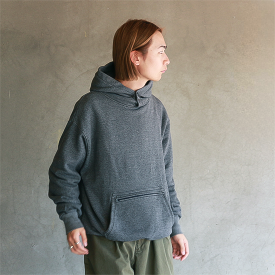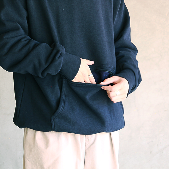 首元に縦に並んだ2つのスナップボタンと、フロントとバックに配されたカンガルーポケットが特徴。フロント側は上部のファスナーポケットとサイドポケットで2層構造になっており、機能性と遊び心を兼ね備えています。