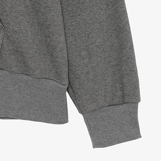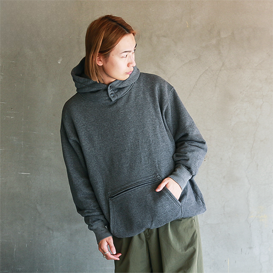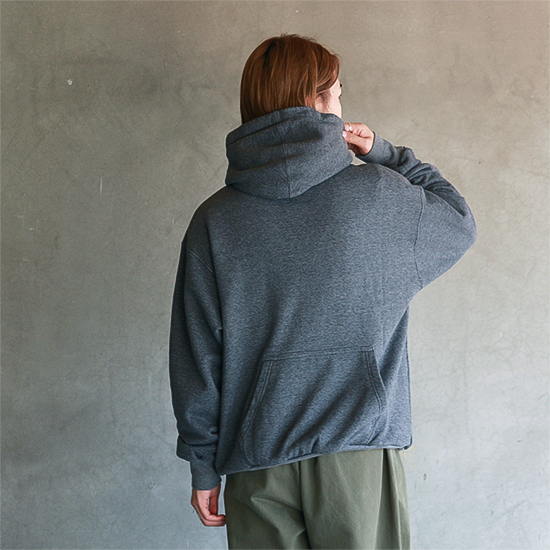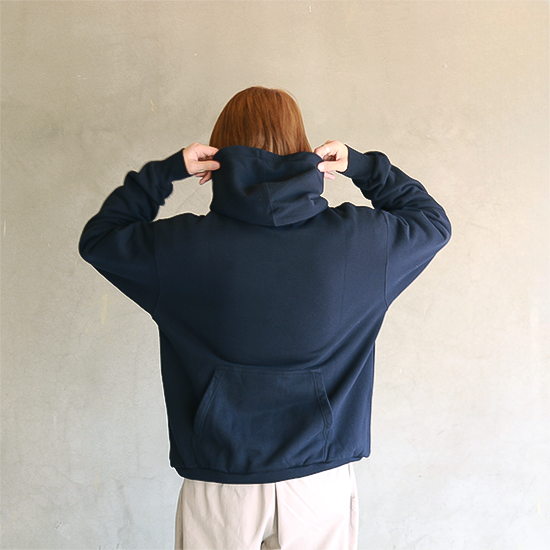 和歌山に数台しかない1970年代頃の初期型「アズマ編み機」で、ヘビーウエイトの裏毛素材をゆっくりと編み上げ、一日に1反〜2反しか生産できない希少なフーディー。