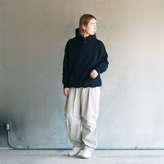 膨らみのある柔らかな生地感と、製品洗い加工による自然な風合いと肌馴染みが魅力です。