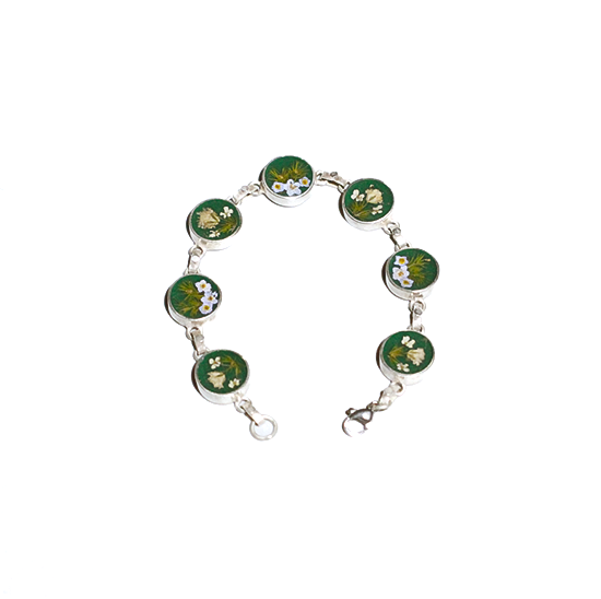 押し花を閉じ込めたトップを使用したブレスレットになります。